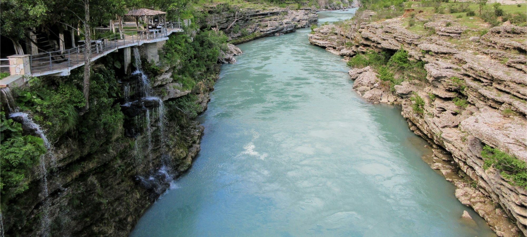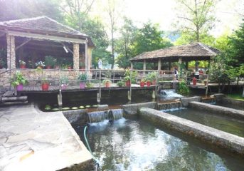 We continue cycling uphill on a tiny road cut into the mountainside up to Përmet, a town perched on the cliff high above the river. Përmet is famed for its cuisine, especially sweets, ‘gliko’ (preserves) and its wine and strong raki. Named the “city of roses” it is said to be the greenest and the cleanest town in Albania. Përmet is also famous for folk music. We cycle on a little further to nearby Benje where there are popular thermal springs – a perfect antidote for tired cyclists’ legs.