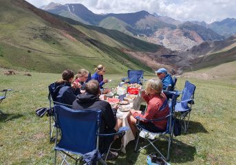 Our Kyrgyzstan cycling tour continues through mountain landscapes as we ride further onwards on traffic-free unpaved roads with more challenging climbs and exciting descents along meandering valley and mountain. Tonight at camp you can indulge in the unique flavors of kymzy, a delightful beverage crafted from the nourishing milk of mares, truly capturing the essence of local culture and taste.