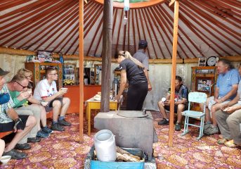 We go on to visit the National Museum and hear an overview of Mongolia’s history from stone age times to the modern era. The Paleontology Museum of Mongolia is a twenty minute walk away from the national museum. It containing artefacts such as dinosaur fossils, intact nests containing eggs, carnivores fighting herbivores and embryos still in their shells. Following this, a visit to the Zaisan memorial in the south of Ulaanbaatar offers panoramic views of the city. There is a 300 step climb to reach the memorial which features a circular painting depicting scenes of friendship between the people of the USSR and Mongolia. Our tour concludes with a traditional music show including a performance of traditional throat singing.