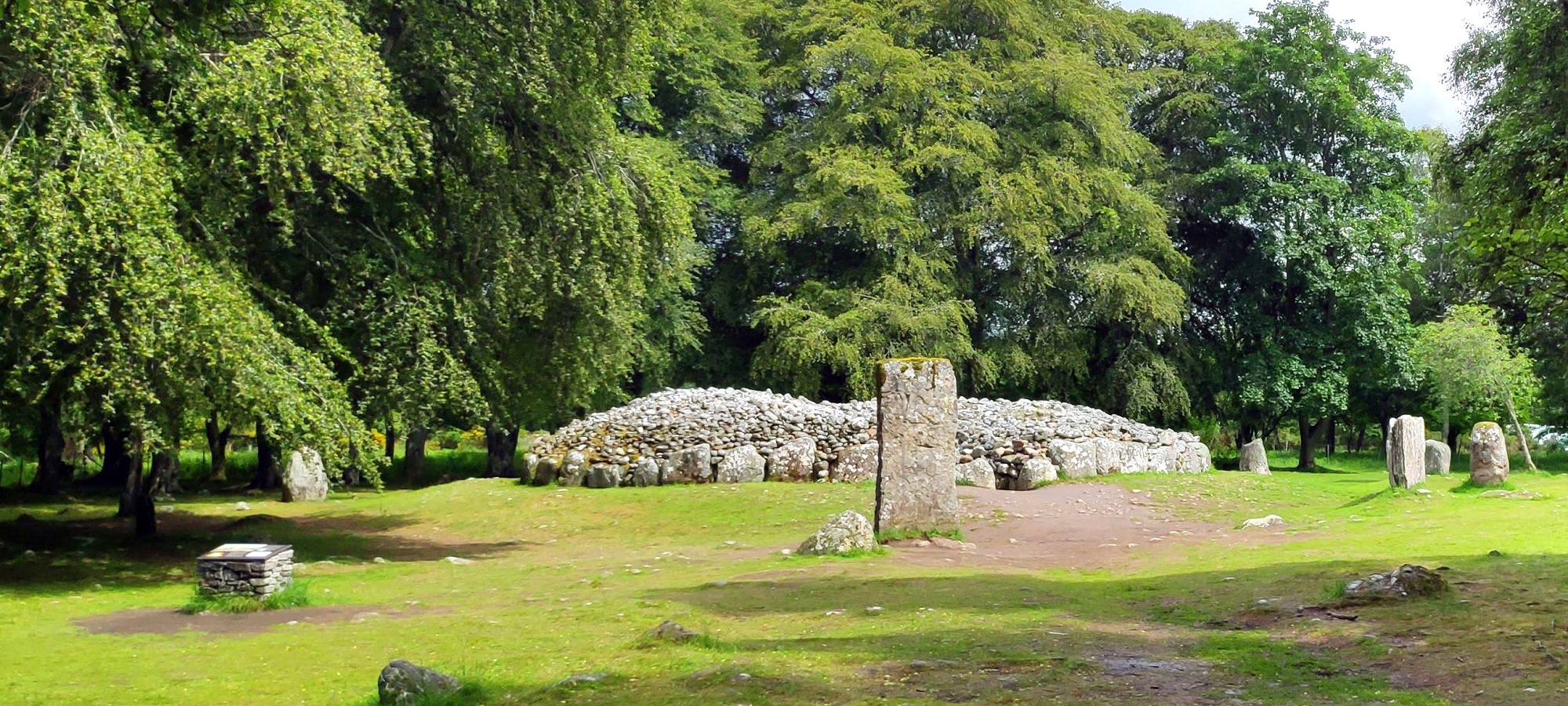 A well-preserved Bronze Age cemetery complex of passage graves; ring and kerb cairns and standing stones in a scenic location. Around 2000 BC a row of large cairns was built, three of which remain today. Use of the cemetery resumed about 100 years later; new burials were placed in some of the existing cairns. Three smaller monuments were built including a ‘kerb cairn’. Remains of a smaller cemetery can also be seen at Milton of Clava, a short distance away. Archaeological excavations have found evidence of farming on the site before any of these monuments were built.